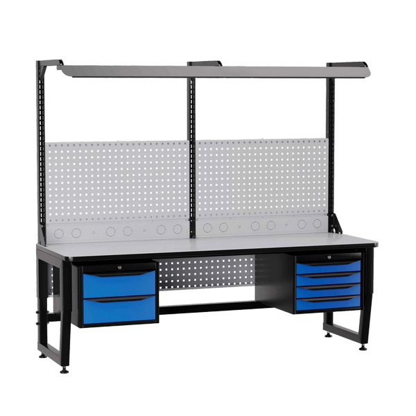 - Укомплектован двумя подвесными тумбами, перфорированными экранами, светильником над столешницей и панелью коммуникаций.
