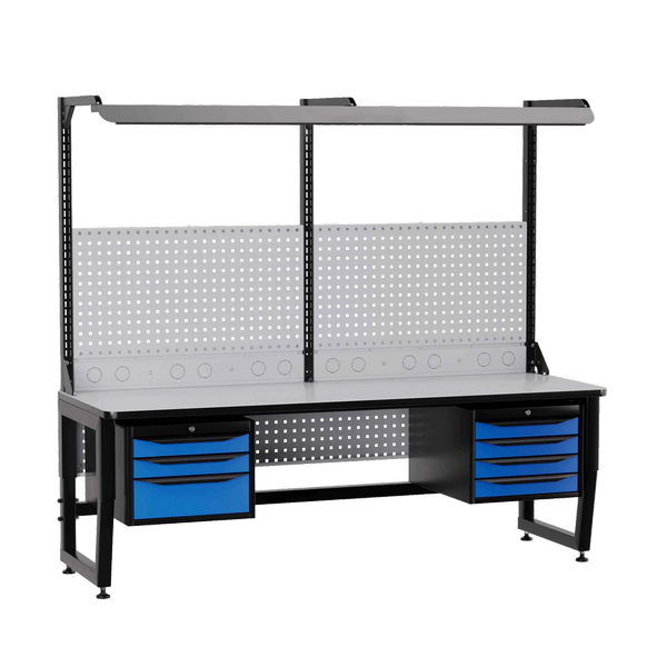 - Оборудован 2 тумбами, перфорированными экранами, светильником над столешницей и панелью коммуникаций.