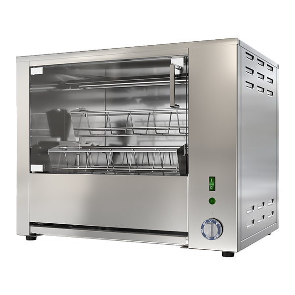 - Вращение четырех садков обеспечивает равномерную тепловую обработку тушек.