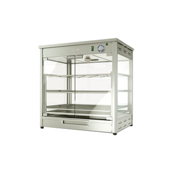 - Готовые блюда размещаются на 3-х полках внутри витрины. Для выемки блюд полки могут выдвигаться на половину своей ширины. Специальные фиксаторы удерживают выдвинутые полки в горизонтальном положении. Перфорация в полках позволяет обеспечить циркуляцию тепла и пара внутри витрины. Температурный режим в витрине регулируется терморегулятором в диапазоне от +30...+85°С. Витрина может обеспечить пароувлажнение внутри камеры. Для этого необходимо в специальный поддон залить 1,5 литра воды. На дне витрины расположен специальный поддон для сбора излишков влаги и жира. Подсветка внутри витрины осуществляется с помощью лампы 25Вт.