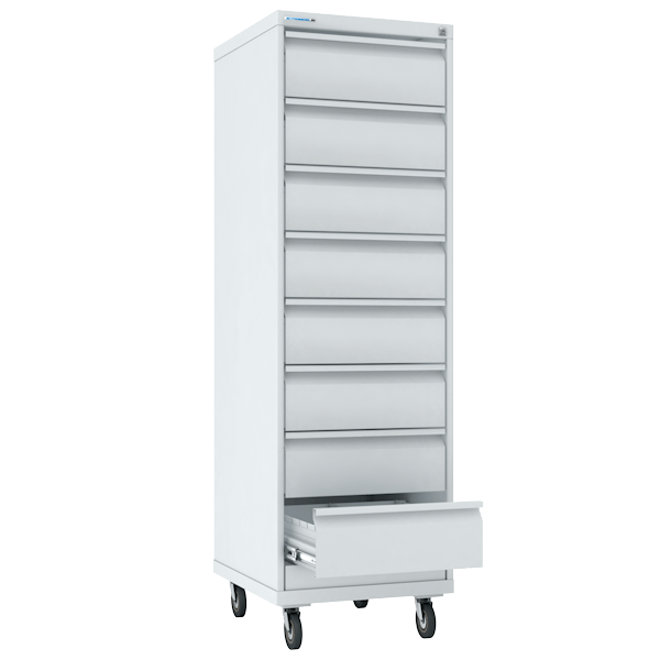 - Шкаф на подставке с колёсами с 8 выдвижными ящиками на телескопических направляющих.