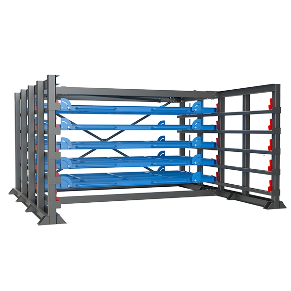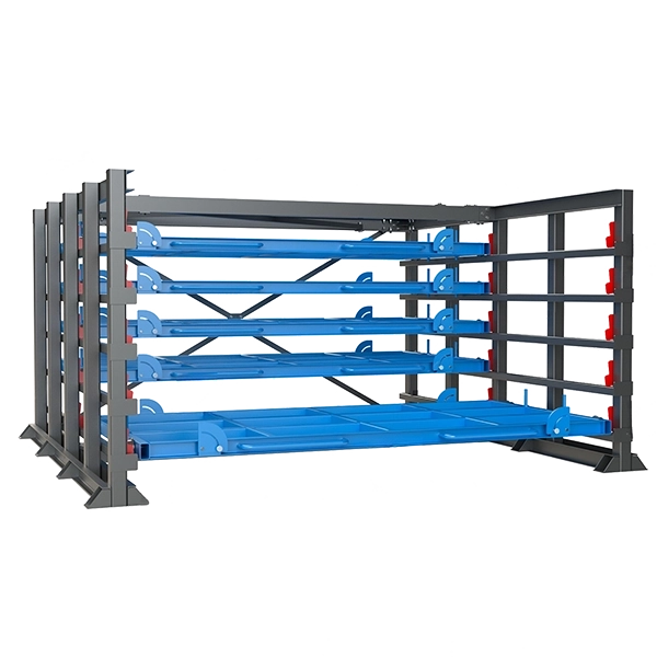 - Стеллаж для хранения листового металла с выкатными полками предназначен для компактного и безопасного размещения тяжелых металлических листов, упрощая доступ к материалам и повышая эффективность работы на складе или в цеху.