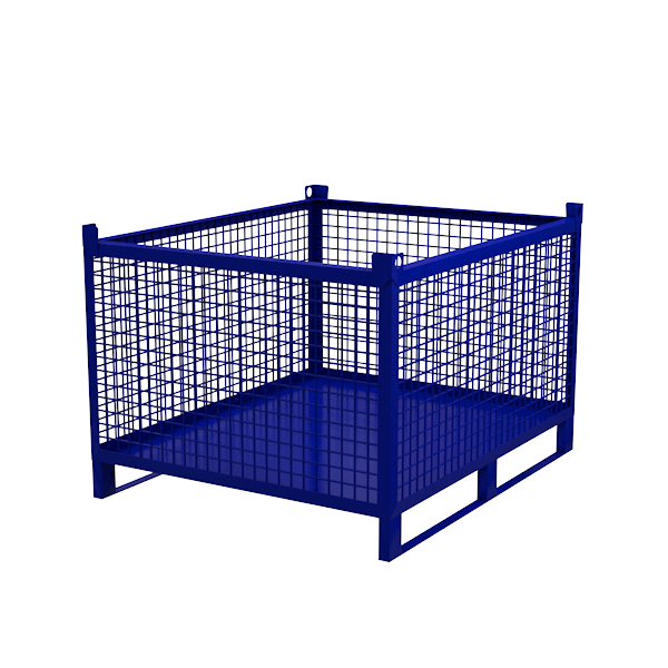 - Контейнер оснащён опорными швеллерами, за счет чего может устанавливаться на ригели стеллажей, а также транспортироваться вилочными погрузчиками, гидравлическими ручными тележками.