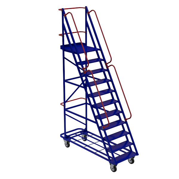 - Поверхности окрашены в контрастные цвета: порошковая краска RAL 5002 (синий), поручни и рабочая площадка RAL 3020 (красный).