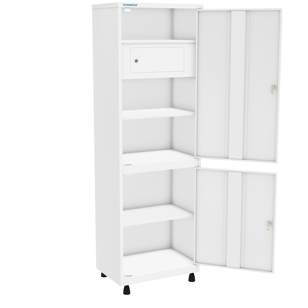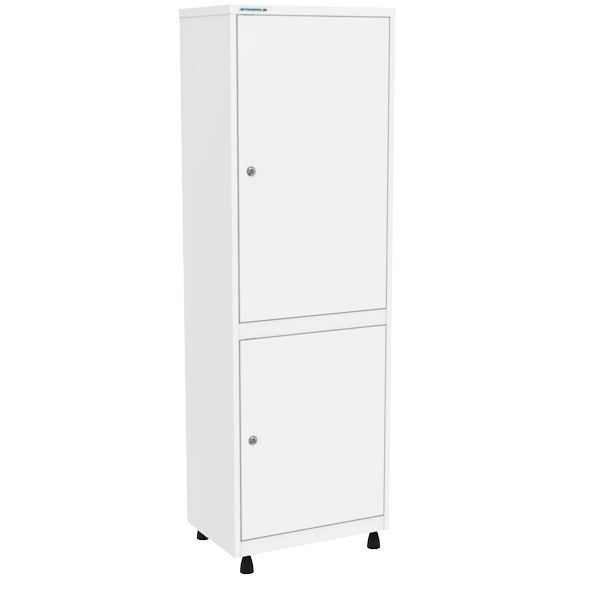 - В верхнем отделении шкаф оборудован закрываемым трейзером, полкой, дверкой с ключевым замком.