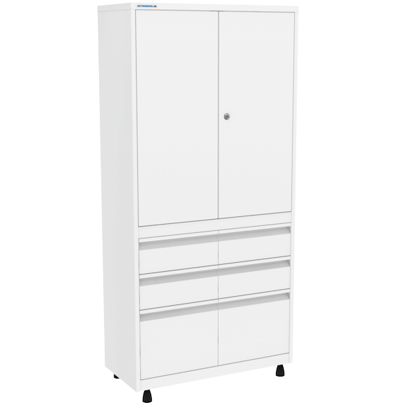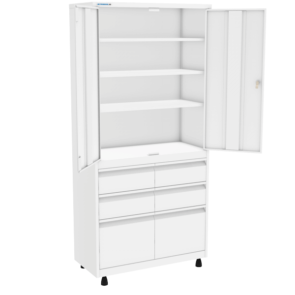 - В верхнем отделении оборудован двумя прочными металлическими дверями и тремя металлическими полками.