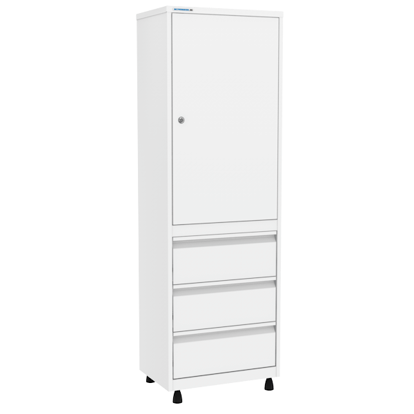 - Верхняя часть оборудована запираемой металлической дверцей и тремя металлическими полками.