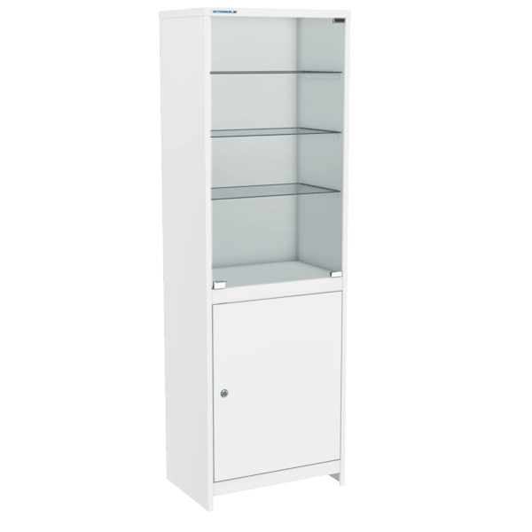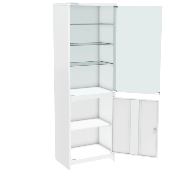 - В нижнем отделении расположена металлическая дверка с ключевым замком и металлическая полка.