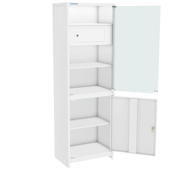 - В верхнем отделении шкаф оборудован металлической полочкой, запираемым трейзером и стеклянной дверцей, которая закрывается на магнитную защелку.