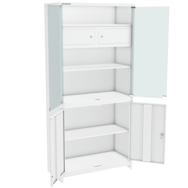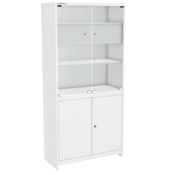 - В верхнем отделении оснащен металлической полкой, двумя стеклянными дверками, которые запираются на магнитные защелки; двумя трейзерами, оборудованными ключевыми замками.