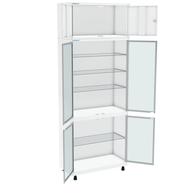 - Состоит из двух отделений со стеклянными дверцами и антресолью с металлическими дверцами.