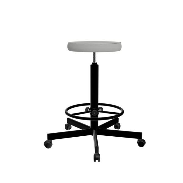 - Табурет на винтовой опоре обивка светло-серая Т02-1/К каркас черный – надежное, удобное и стильное решение для медицинских кабинетов, лабораторий, косметологических салонов и рабочих зон.