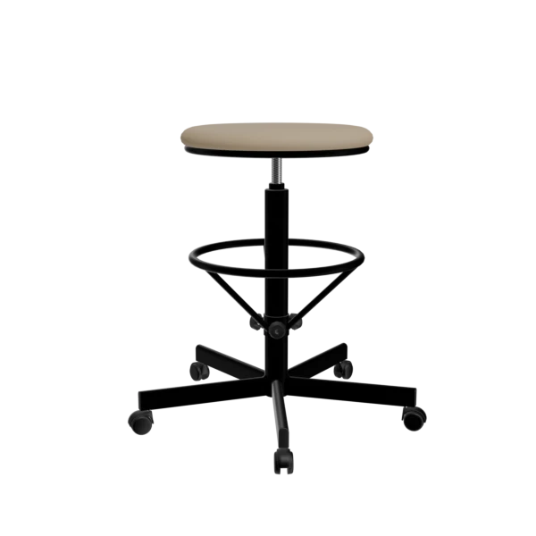 - Табурет на винтовой опоре с усиленной опорой для ног Т03/К (на колесах), обивка кремовая, каркас черный — это стильное и практичное решение для офисов, медицинских учреждений, а также других рабочих помещений, где важно сочетание удобства и мобильности.