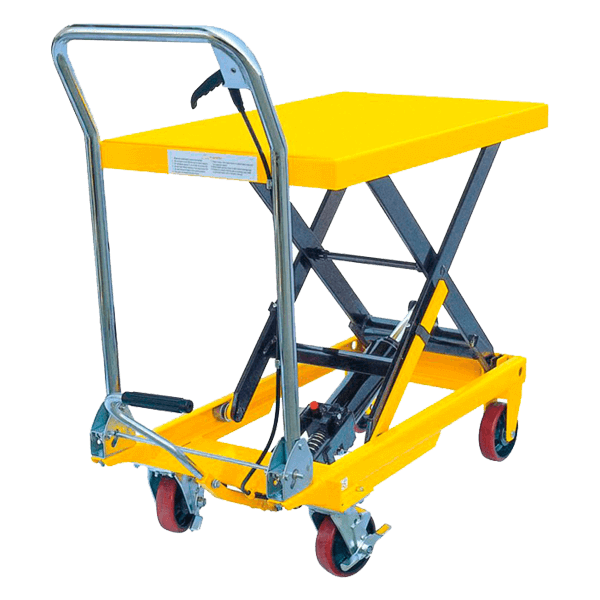 - Комплектуется ручкой управления с рычагом, платформой на ножничном механизме с гидравлическим приводом и колёсами, входящими в конструкцию гидравлического привода.