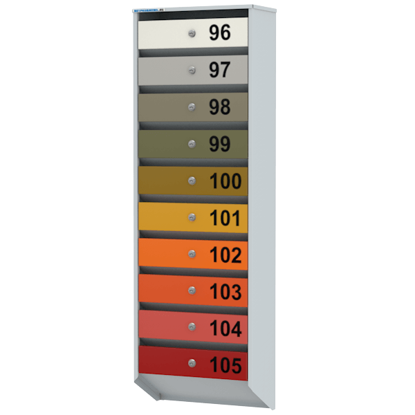 - Поделён на десять одинаковых ячеек, укомплектованных металлическими дверцами.