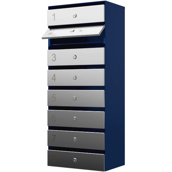 - Конструкция включает восемь одинаковых ячеек, каждая оснащена индивидуальным почтовым замком с ключом.