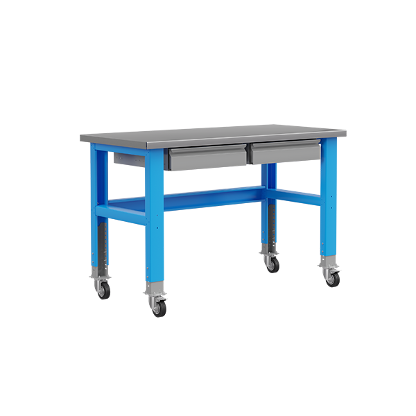- Состоит из рамы, столешницы из холоднокатаной стали, регулировочных опор и комплекта колёс.