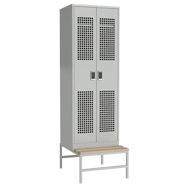Шкаф для одежды металлический перфорированный на подставке со скамьей с электронным замком