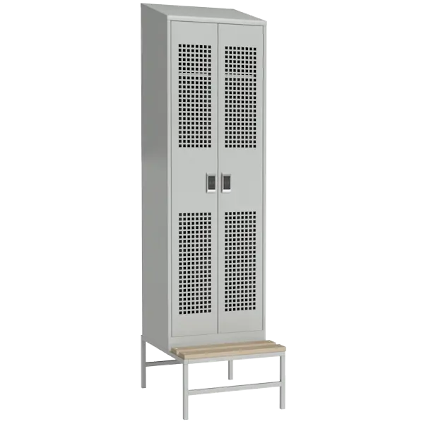 Шкаф со скамьей на подставке оснащенный перфорированными дверьми и электронным замком