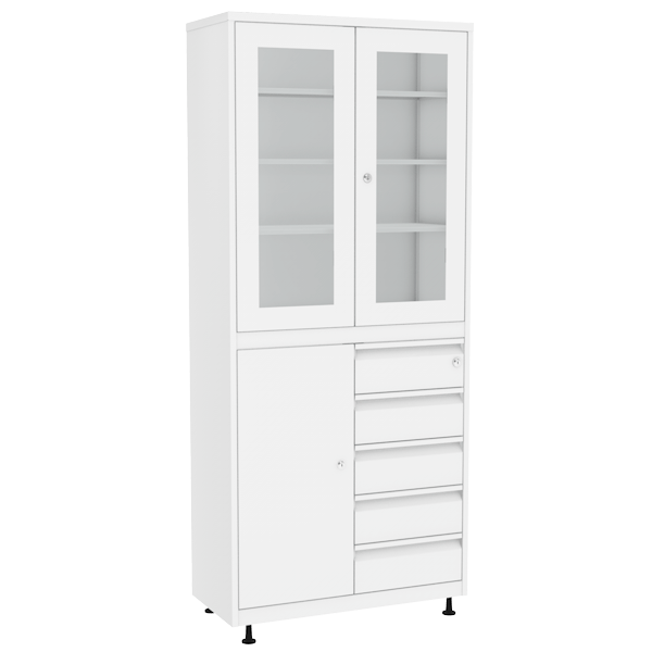 - В верхней части шкафа находятся две стеклянные двери в металлической окантовке и 3 металлические полки для лекарств.