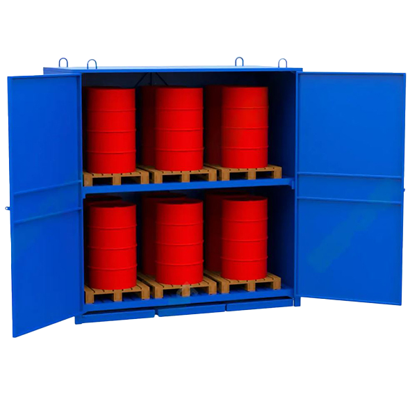 - Данная модель шкафа-депо предназначена для размещения до 12 бочек объемом 200 литров на стандартных паллетах с воспламеняющимися и опасными для окружающей среды жидкостями.
