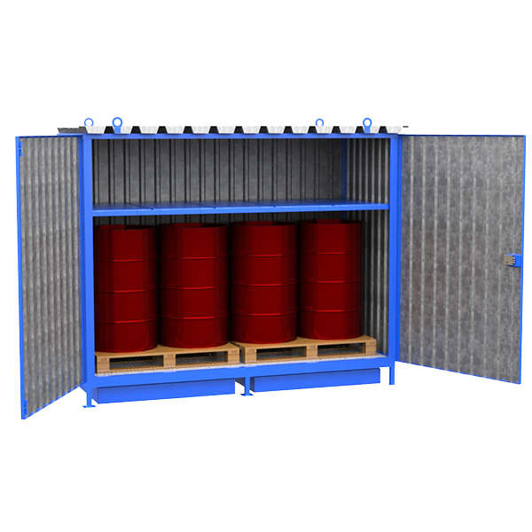 - Данная модель шкафа-депо предназначена для размещения до 8 бочек объемом 200 литров на стандартных паллетах с воспламеняющимися и опасными для окружающей среды жидкостями.