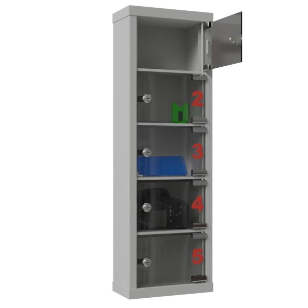 - Шкаф выполнен из прочного металла и разделён на 5 отдельных ячеек, каждая из которых оснащена индивидуальным замком.