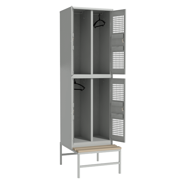 Сварной шкаф для одежды со скамьей на подставке с перфорированными дверцами