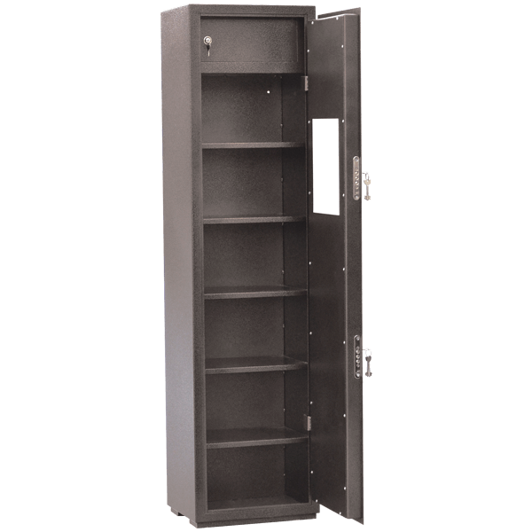 - Комплектуется 6 полками, также имеет дополнительное запираемое отделение под боеприпасы (трейзер).