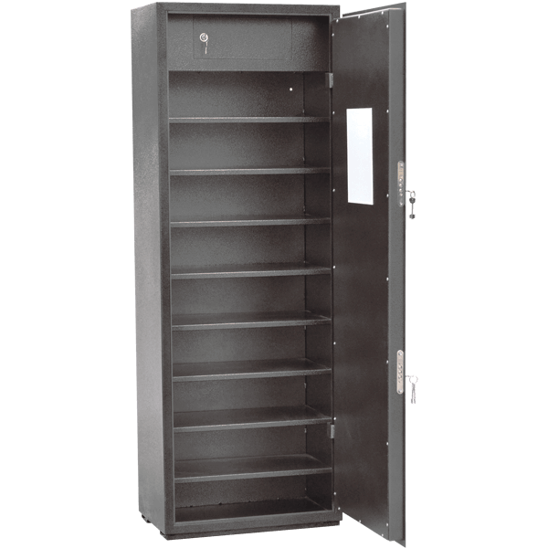 - Внутри шкаф имеет дополнительное запираемое отделение под боеприпасы.