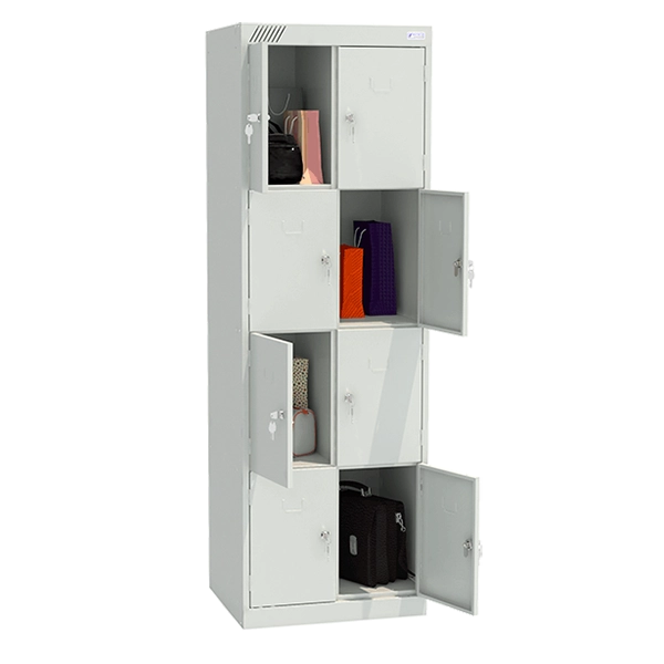 - Шкаф состоит из двух секций и восьми индивидуальных ячеек, каждая из которых оснащена распашной дверцей с замком повышенной секретности. Такое решение позволяет безопасно хранить личные вещи, сумки и рюкзаки.