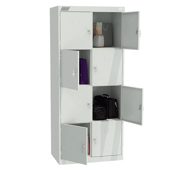 - Модель состоит из двух секций и восьми индивидуальных ячеек, каждая из которых оснащена замком повышенной секретности, что позволяет надежно хранить личные вещи посетителей и сотрудников.