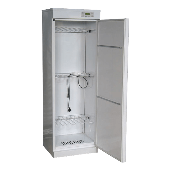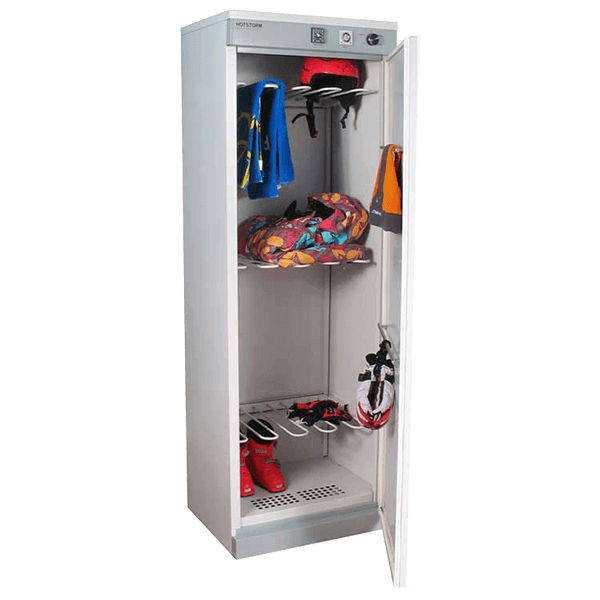 - Конструкция — металлический корпус из одной секции с дверцей; сушильные полки, две нижние — откидывающиеся.