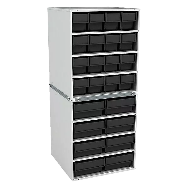 - Кассетница собирается из двух кассет K-01/1 (8 ящиков по 7 литров каждый) и K-01/2 (16 ящиков по 3,5 л каждый).