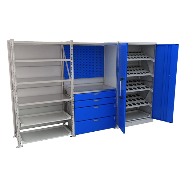 - Оснащен выдвижными ящиками высотой 135 мм и 275 мм с полезной площадью 986x493 мм и полками из оцинкованной стали с ребрами жесткости.