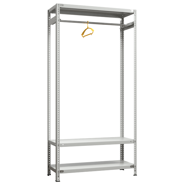 - Одиночная секция состоит из 4 перфорированных стоек, трёх полок и одного яруса-вешала со штангой для плечиков.
