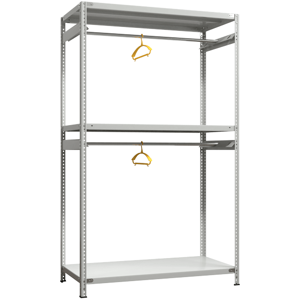 - Комплектуется тремя полками и двумя ярусами-вешалами с перекладиной (штангой) для одежды на плечиках.