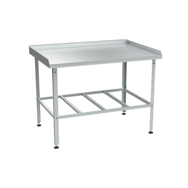 - Оснащён тремя бортами высотой 50 мм, оцинкованной полкой-решёткой и регулируемыми по высоте опорами.