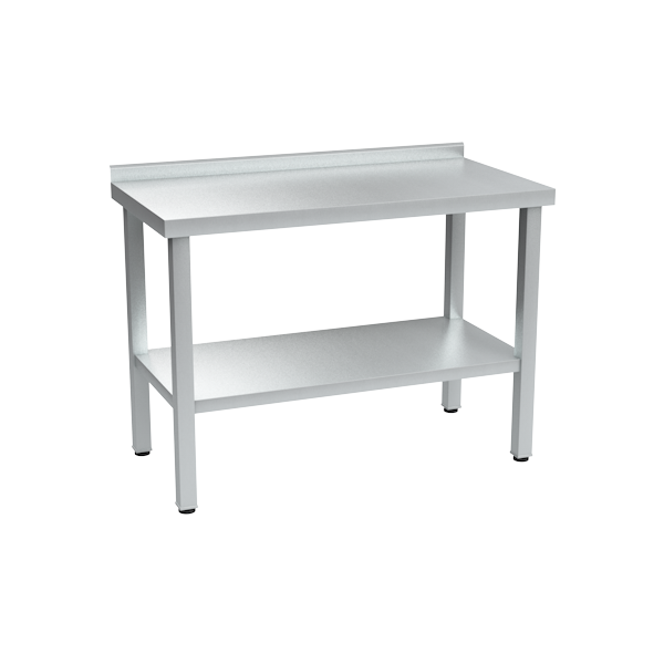 - Стол комплектуется пристенным бортом высотой 50 мм, сплошной полкой и регулируемыми по высоте опорами, компенсирующими неровности пола.