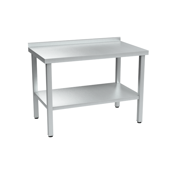 - Укомплектован сплошной полкой, пристенным бортом высотой 50 мм и регулируемыми по высоте опорами, которые компенсируют неровности пола.