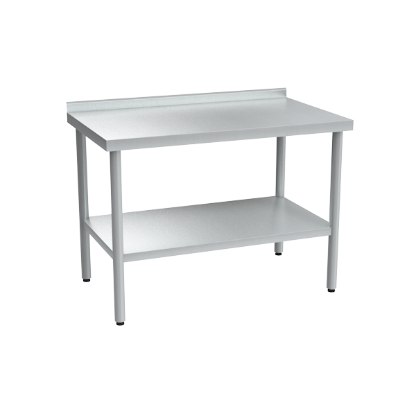 - Оборудован задним бортом высотой 50 мм, а рабочая поверхность дополнена прочной полкой из нержавеющей стали AISI 430 толщиной 0,8 мм.
