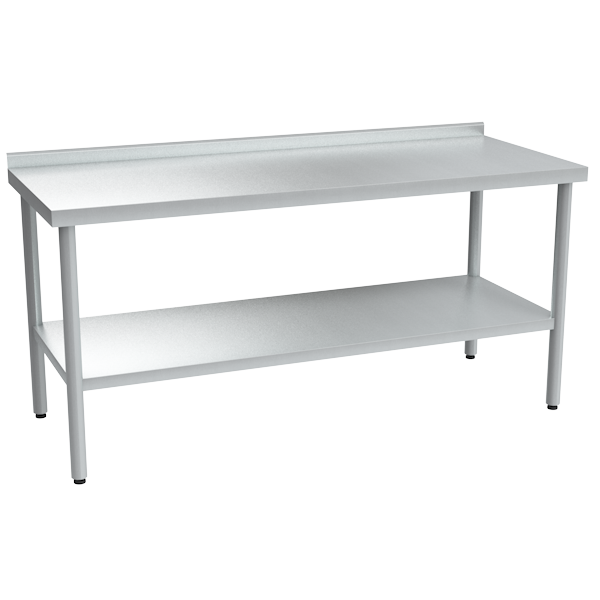 - Оснащён пристенным бортом высотой 50 мм, сплошной полкой и регулируемыми по высоте опорами на ножках, которые компенсируют неровности пола.