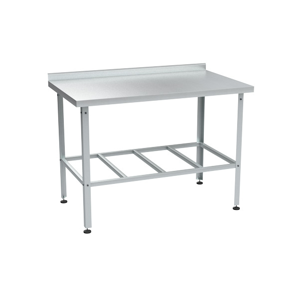 - Оснащён пристенным бортом высотой 50 мм и сплошной либо решётчатой полкой.