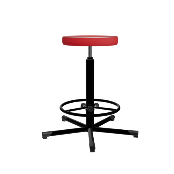 - Табурет на винтовой опоре с красной обивкой Т02-1 и черным каркасом – практичное и современное решение для лабораторий, офисов и косметологических кабинетов.