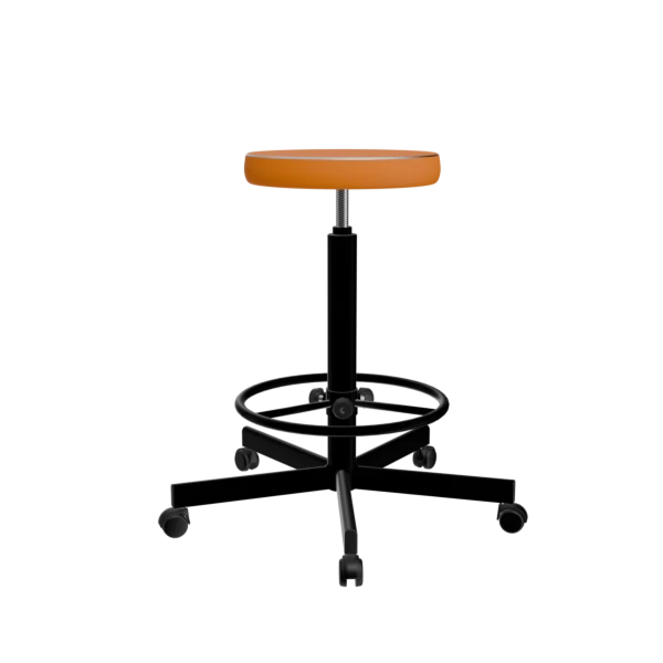 - Табурет на винтовой опоре с оранжевой обивкой Т02-1/К и черным каркасом – практичный и стильный выбор для лабораторий, салонов и рабочих зон.