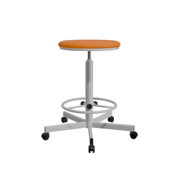 - Табурет на винтовой опоре Т02/К с оранжевой обивкой и белым каркасом — практичный и комфортный вариант для лабораторий, салонов красоты и офисов.