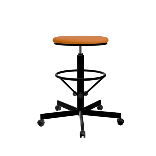 - Табурет на винтовой опоре с усиленной опорой для ног Т03/К (на колесах), обивка оранжевая, каркас черный – удобное и функциональное решение для косметологических салонов, лабораторий и мастерских.