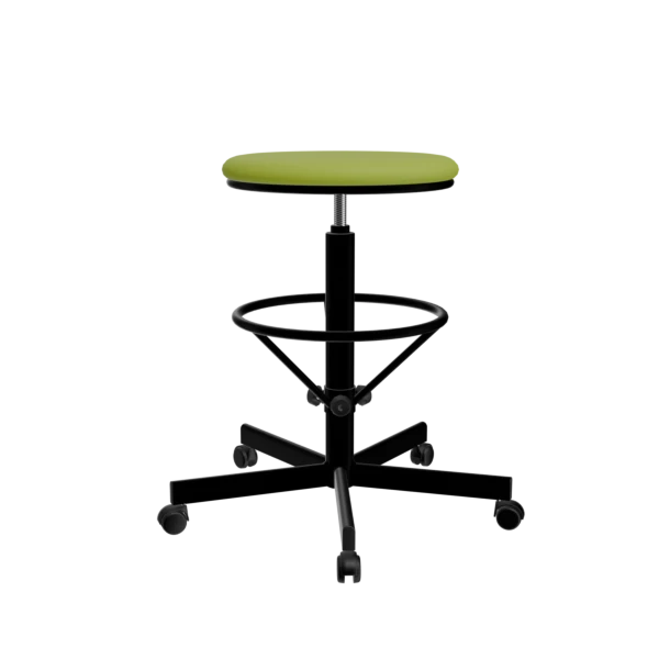 - Мобильный табурет Т03/К с яркой светло-зеленой обивкой и черным металлическим каркасом – идеальное решение для салонов красоты, лабораторий и мастерских.