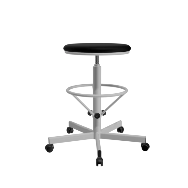 - Табурет на винтовой опоре с усиленной опорой для ног Т03/К (на колесах), обивка черная, каркас белый — эргономичное и надежное решение для производственных, технических и рабочих помещений.