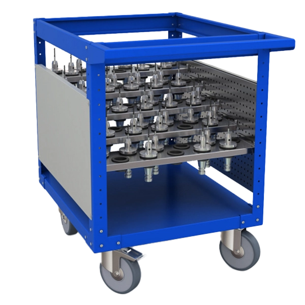 - Тележка комплектуется полками для хранения инструмента с хвостовиком типа ISO/SK 40 — всего предусмотрено 55 гнезд (5 полок по 11 гнезд).